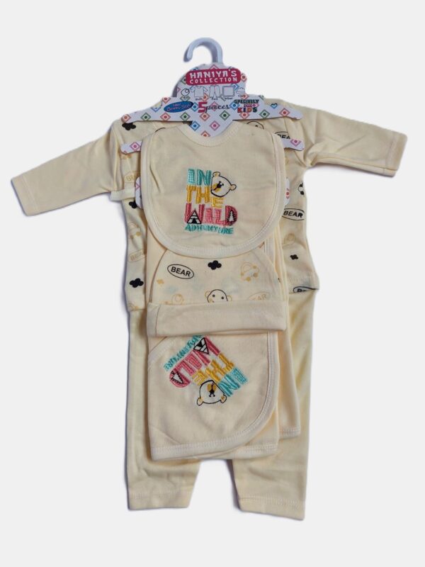 This all-in-one Adventure Newborn Starter Set from Haniya’s Collection is designed to provide a coordinated and charming look for your newborn. The set is meticulously assembled to include a full-sleeve shirt, matching pants, a soft bib, a comfortable cap, and a multipurpose shawl. Each piece features a consistent “In The Wild Adventure” bear theme, ensuring your little one is ready for their first journey home in style.
