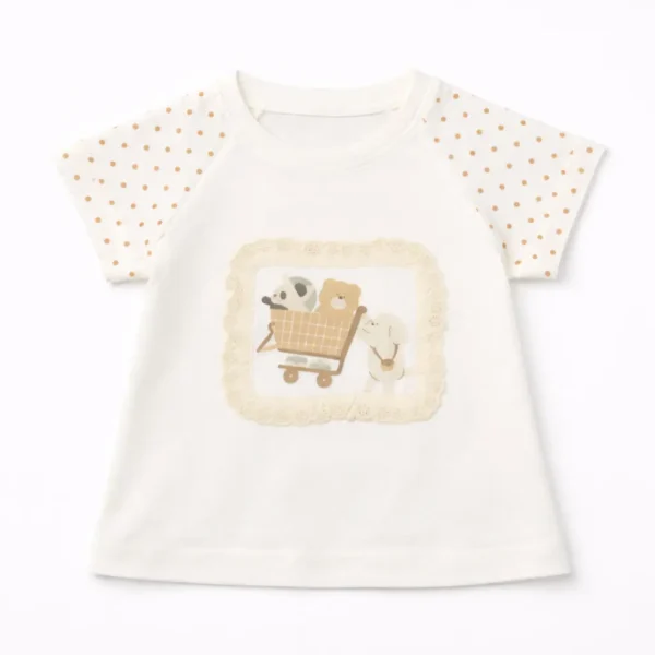 The front of the T-shirt includes a cute character patch design with lace-style detailing, adding a playful and soft visual appeal without overpowering the outfit.
