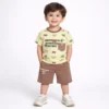 This complete outfit includes matching brown shorts designed for a perfect fit. The shorts are equipped with practical side pockets, allowing kids to carry their small toys or treasures while on the go.