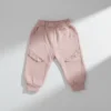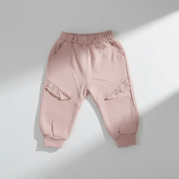 The trousers include inner pockets and subtle ruffle accents for added charm. The elastic waistband provides a secure yet flexible fit for growing kids.